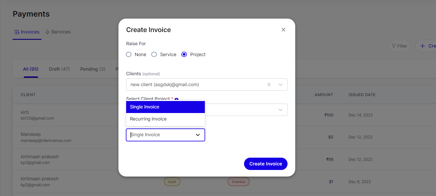 ClientVenue allows you to create project-wise and service-wise invoices for every service you render. Similarly, you can also create new invoices for clients with ongoing projects.